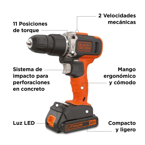 Taladro Inalámbrico Black & Decker 20 volt. Mandril 3/8″. Percutor. 1 Batería